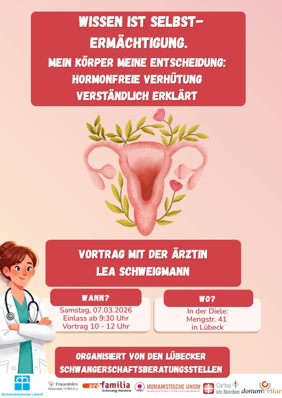 Im Rahmen des Weltfrauentags findet am 07.03. 2026 von 10-12 Uhr ein Vortrag mit der Ärztin Lea Schweigmann über nicht-hormonellen Verhütungsmittel in der Diele, Mengstr. 41 in Lübeck statt. Der Titel der Veranstaltung ist „Wissen ist Selbst-ermächtigung. Mein Körper meine Entscheidung: Hormonfreie Verhütung verständlich erklärt“. Organisiert wird die Veranstaltung von den Lübecker Schwangerschaftsberatungsstellen.